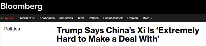 FX168财经报社(亚太)讯 美国总统特朗普(Donald Trump)深夜在社交媒体上发帖称,与中国国家主席习近平达成协议非常困难,美国彭博社报道称,这令两位领导人立即通话的可能性变得渺茫。