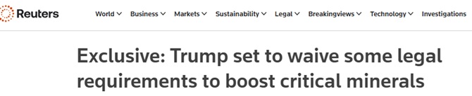 FX168财经报社(亚太)讯 英国路透社周三(6月4日)发布独家称,据路透社看到的一份文件显示,美国总统特朗普(Donald Trump)将使用紧急权力并大幅削减一些法律要求,包括一些国会拨款批准。这些要求与一项旨在提高美国关键矿产和武器生产的法律相关。