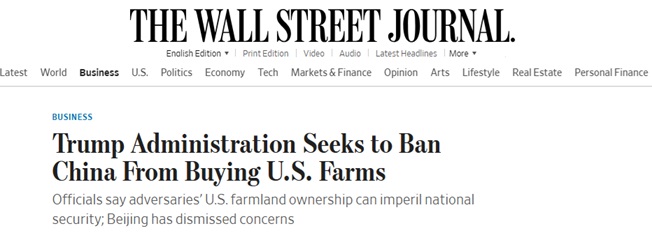 中美突传大消息!华尔街日报:特朗普政府寻求禁止中国购买美国农地