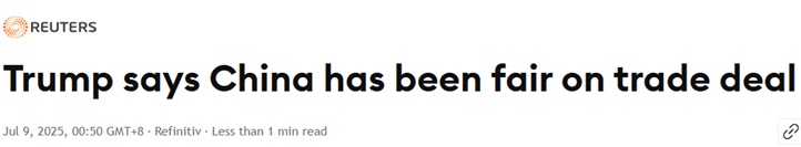 FX168财经报社(亚太)讯 英国路透社周三(7月9日)报道称,美国总统特朗普(Donald Trump)表示,中国在与美国的贸易协议中“非常公平”,而且他最近与中国的关系良好。