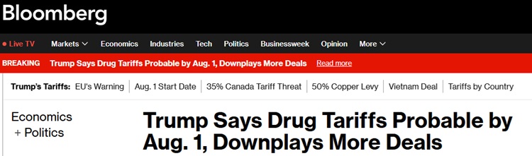 FX168财经报社(亚太)讯 美国彭博社当地时间周二(7月15日)报道称,美国总统特朗普(Donald Trump)表示,他可能最早在本月底对药品征收关税,并且也可能很快对半导体征税。这表明这些进口税可能会与定于8月1日实施的广泛“对等”税率同时实施。