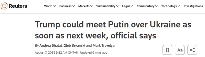 FX168财经报社(亚太)讯 白宫官员周三(8月6日)表示,美国总统特朗普(Donald Trump)最早可能于下周会见俄罗斯总统普京(Vladimir Putin)。与此同时,美国继续准备实施二级制裁,以向莫斯科施压,迫使其结束乌克兰战争。