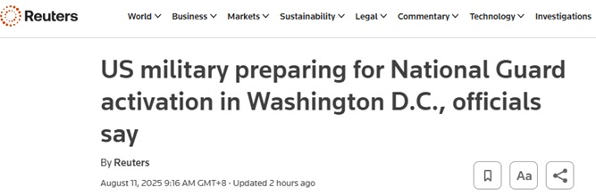 FX168财经报社(亚太)讯 英国路透社周一(8月11日)报道称,两名美国官员周日告诉路透社,美国军方正准备向华盛顿特区派遣数百名国民警卫队士兵。