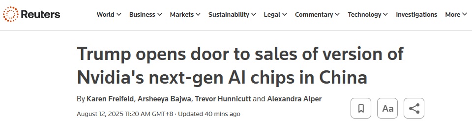 FX168财经报社(亚太)讯 英国路透社周二(8月12日)报道称,尽管华盛顿方面对中国可能利用美国人工智能(AI)增强军事实力的担忧根深蒂固,但美国总统特朗普(Donald Trump)周一暗示,他可能会允许英伟达(Nvidia)在中国销售简化版的下一代先进GPU芯片。