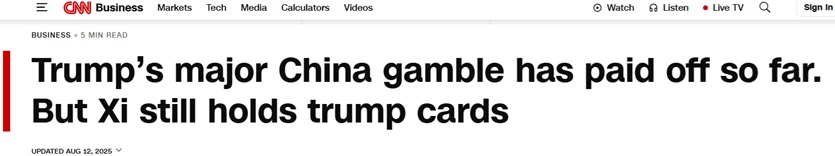 CNN于当地时间8月12日发布的文章指出,习近平也正处于连胜的势头之中。周一,特朗普在放行了此前被封锁的中端芯片后,又开启向中国供应更快人工智能芯片的大门。尽管美国加征关税,中国仍成功找到了其他市场,向全球市场销售其产品。