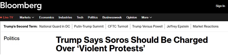 FX168财经报社(亚太)讯 美国总统特朗普(Donald Trump)表示,金融巨鳄、亿万富翁乔治·索罗斯(George Soros)和他的儿子应该因涉嫌支持美国各地的“暴力抗议”以及“其他更多行为”而被指控犯有敲诈勒索罪。但特朗普并未提供任何证据。