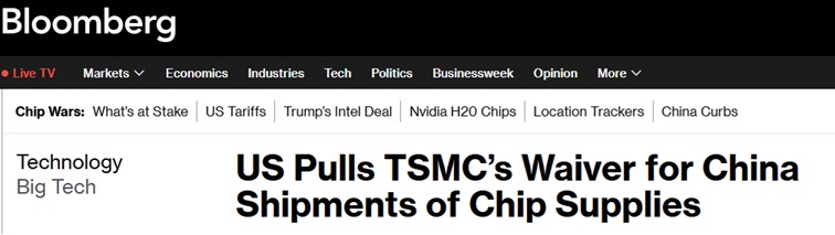 彭博社指出,华盛顿的这一举动意味着,台积电的供应商若要向南京工厂运送受美国出口管制的半导体设备和其他器材,必须逐一申请批准,而不是像目前那样,由于该工厂的VEU资格而获得全面授权。