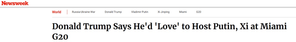 FX168财经报社(亚太)讯 美国《新闻周刊》上周六(9月6日)报道称,美国总统特朗普(Donald Trump)表达了对俄罗斯总统普京(Vladimir Putin)和中国国家主席习近平明年出席在佛罗里达州举行的二十国集团(G20)领导人峰会的热情。