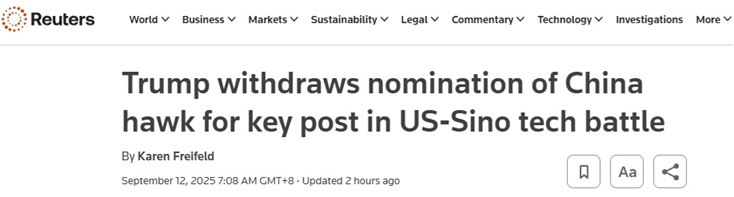 FX168财经报社(亚太)讯 英国路透社周五(9月12日)报道称,美国总统特朗普(Donald Trump)撤销了对华鹰派人物兰登·海德(Landon Heid)出任中美科技战关键职位的提名,这引发了人们的疑问,即此举是否预示着特朗普对北京方面采取更为鸽派的态度。