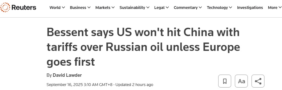 FX168财经报社(亚太)讯 英国路透社周二(9月16日)报道称,美国财政部长贝森特(Scott Bessent)周一表示,除非欧洲国家对中国和印度征收高额关税,否则特朗普政府不会对中国商品征收额外关税以阻止中国购买俄罗斯石油。