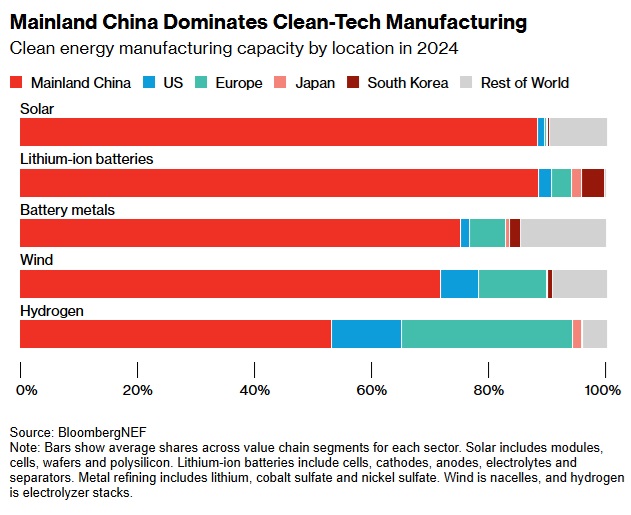 中国生产了全球约80%的太阳能电池板,供应了全球约60%的风力涡轮机、70%的电动汽车和75%的电池,而且成本低于西方国家。