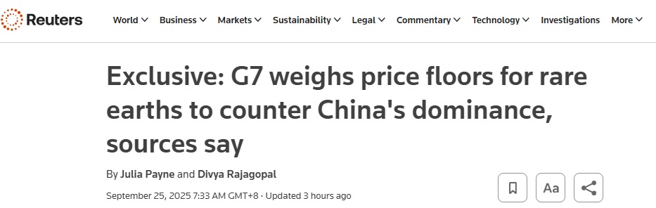 稀土战升级!路透独家:G7考虑设定稀土价格下限以对抗中国主导地位