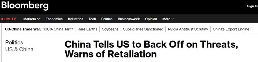 美国总统特朗普(Donald Trump)宣布将对中国加征100%新关税。中国表示,美国应停止以提高关税相威胁,敦促进一步谈判解决悬而未决的贸易问题,中方并警告称,如果华盛顿坚持对北京采取措施,中国将毫不犹豫地予以报复。