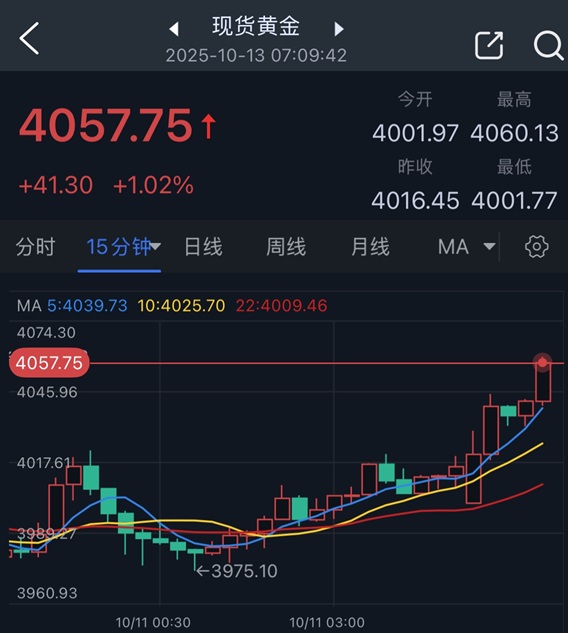 FX168财经报社(亚太)讯 周一(10月13日)亚洲市场交易开始后,现货黄金大幅攀升,金价刚刚触及4060.13美元/盎司,创下历史新高,金价日内涨幅超过40美元。