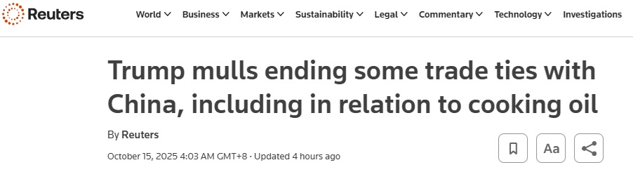 英国路透社报道称,美国总统特朗普当地时间周二表示,华盛顿正在考虑终止与中国的一些贸易关系,包括与食用油有关的贸易关系。