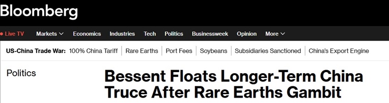 FX168财经报社(亚太)讯 美国彭博社周四(10月16日)报道称,美国财长贝森特(Scott Bessent)暗示,如果中国停止实施严格的新稀土出口管制计划,美国可能将暂停对中国商品征收进口关税的期限延长至三个月以上。