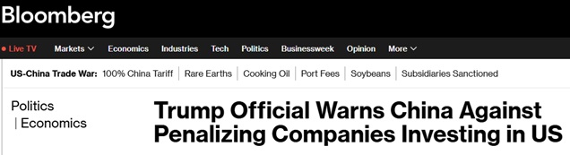 FX168财经报社(亚太)讯 美国彭博社周二(10月21日)报道称,特朗普政府警告中国不要对帮助美国发展关键产业的外国公司进行报复。上周,北京方面因一家韩国航运巨头计划投资美国航运业而对其美国子公司实施制裁。