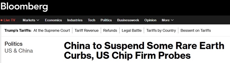 FX168财经报社(亚太)讯 美国彭博社周日(11月2日)报道称,白宫宣布,中国将有效暂停对稀土金属实施额外的出口管制,并终止针对美国半导体供应链企业的调查。