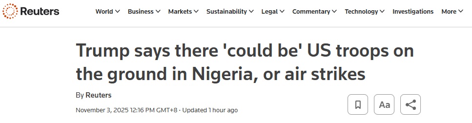 当被随行记者问及“是否考虑向尼日利亚派遣地面部队或发动空袭”时,特朗普在空军一号上告诉记者,“有可能,我是说,还有其他方案,我设想了很多可能性。他们在尼日利亚杀害的基督徒人数创下纪录……他们正在杀害基督徒,而且人数非常多。我们绝不会允许这种情况发生。”