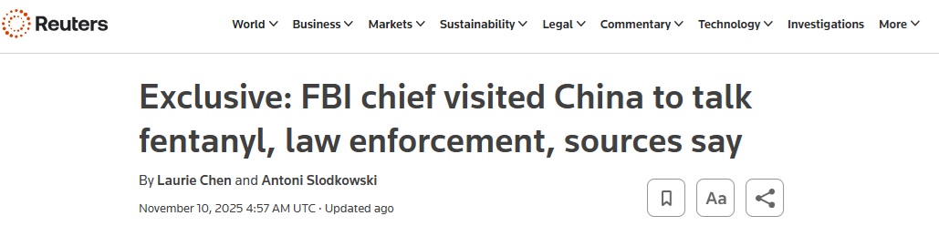 FX168财经报社(亚太)讯 英国路透社周一(11月10日)发布独家报道称,两名知情人士透露,美国联邦调查局(FBI)局长卡什·帕特尔(Kash Patel)上周访问了中国,讨论芬太尼和执法问题。此前,中美领导人举行会晤,双方在会上就相关议题达成共识。