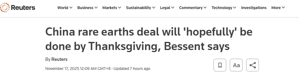 FX168财经报社(亚太)讯 美国财政部长贝森特(Scott Bessent)在周日(11月16日)播出的讲话中表示,美国和中国之间的稀土协议“有望”在感恩节前达成。