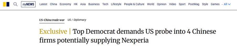 中美突发重磅!南华早报独家:民主党高层要求调查四家可能向安世供货的中企
