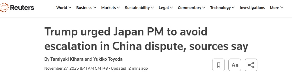 FX168财经报社(亚太)讯 英国路透社周四(11月27日)最新报道称,据两名了解情况的日本政府消息人士透露,美国总统特朗普(Donald Trump)在本周的一次通话中敦促日本首相高市早苗(Sanae Takaichi)避免在与中国的争端中进一步升级。