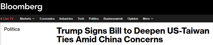 FX168财经报社(亚太)讯 美国彭博社周三(12月3日)报道称,据白宫称,美国总统特朗普(Donald Trump)周二签署一项法案使其正式成为法律。该法案要求美国国务院审查有关与台湾交往的指导方针。此举正值外界对北京可能对台湾采取行动的担忧不断升级之际。