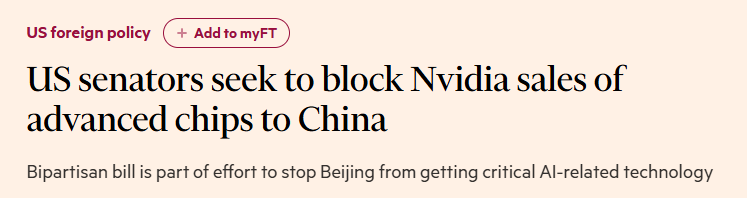 FX168财经报社(北美)讯 美国国会跨党派议员日前提出新法案,拟全面禁止英伟达(Nvidia)向中国出口其最先进的人工智能芯片,显示华盛顿正进一步收紧对北京获取关键 AI 技术的限制。