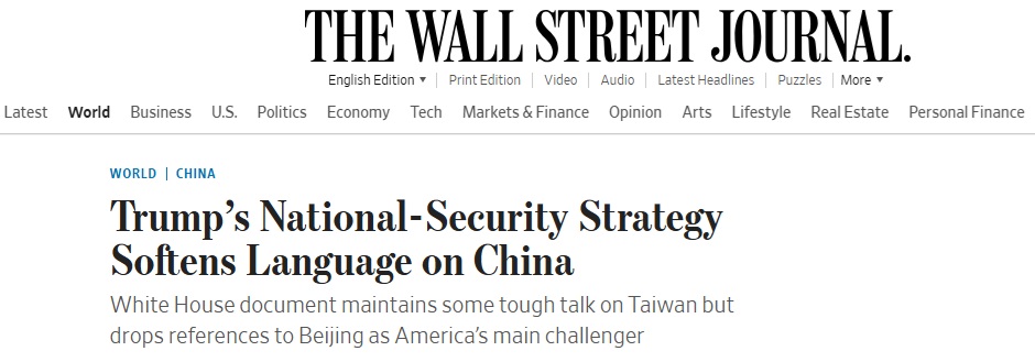 FX168财经报社(亚太)讯 美国《华尔街日报》周日(12月7日)报道称,白宫发布的新《国家安全战略》显示出在与北京竞争问题上采取更为温和的态度:它淡化了两大超级大国之间的意识形态差异,并标志着一项转变——过去数年里,中国一直被单独点名为美国面临的最大挑战。