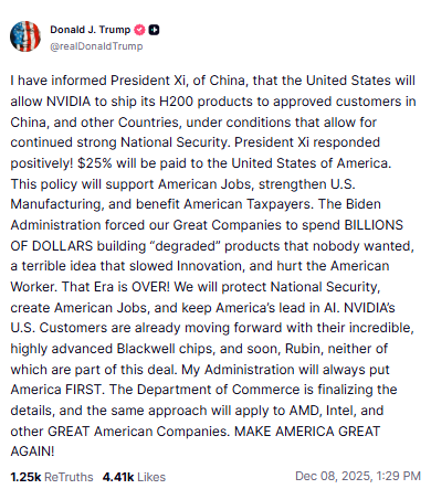 特朗普在 Truth Social 的发文称,中国国家主席习近平对此“作出了积极回应”。根据特朗普公布的协议细节,英伟达需将 25% 的相关芯片销售收入上缴美国政府,以换取出口许可。特朗普表示,这将“确保美国国家安全得到持续保障”。
