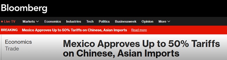 FX168财经报社(亚太)讯 美国彭博社周四(12月11日)最新报道称,墨西哥立法者最终批准对亚洲进口商品征收新关税,这一举措大体上与美国收紧针对中国贸易壁垒的努力保持一致。墨西哥总统辛鲍姆(Claudia Sheinbaum)正寻求保护本国产业。