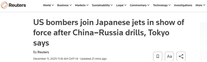 FX168财经报社(亚太)讯 英国路透社周四(12月11日)最新报道称,周三,美国具备携带核武器能力的轰炸机与日本战斗机一道飞越日本海,日本方面称,这是在中俄于日本和韩国周边海空举行联合军演之后进行的一次武力展示。