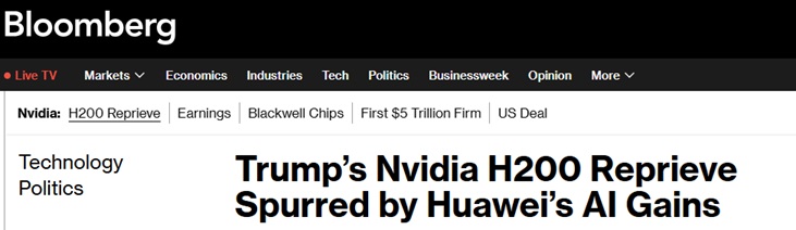 FX168财经报社(亚太)讯 美国彭博社周三(12月10日)发布独家报道称,据一位知情人士透露,美国总统特朗普(Donald Trump)之所以决定允许英伟达公司(Nvidia Corp.)向中国出售其H200人工智能芯片,是因为在经过权衡后,他认为这一举动带来的安全风险相对较低——原因在于该公司在中国的主要竞争对手华为(Huawei Technologies Co.)已经在提供性能相当的人工智能系统。