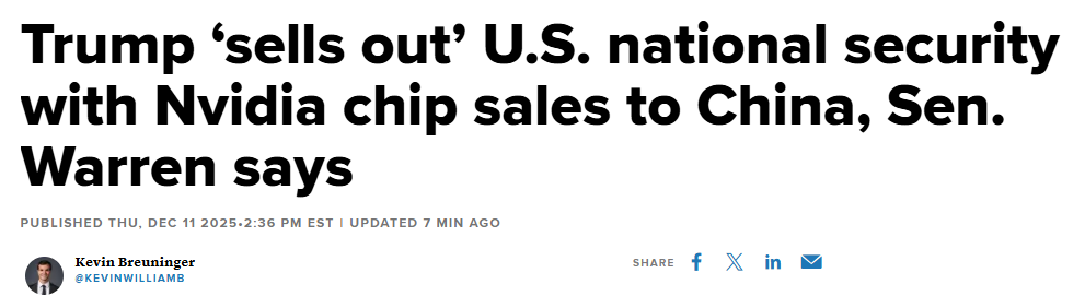 FX168财经报社(北美)讯 美国民主党参议员伊丽莎白·沃伦(Elizabeth Warren)周四(12月10日)表示,特朗普总统允许英伟达(Nvidia)向中国销售其先进的 H200 人工智能芯片的决定是在“出卖美国国家安全”。