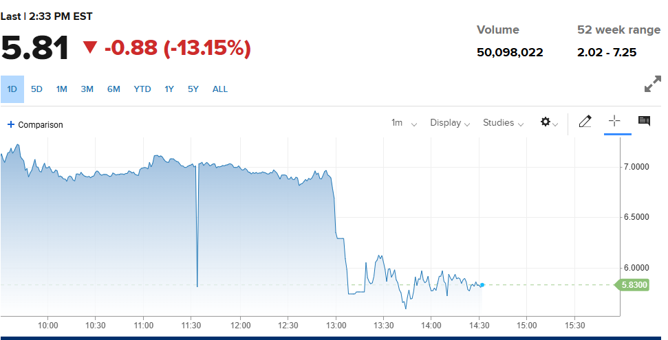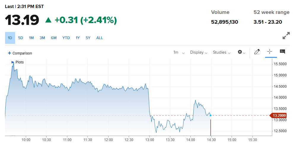 (Tilray Brands走势图,来源:CNBC)