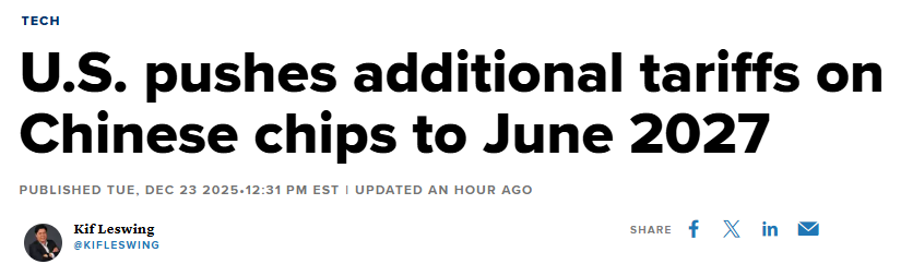 新的2027年时间节点,也为美国企业提供了更明确的政策预期。此前,多家企业表示,正密切关注美国对华半导体关税政策对其业务及供应链布局的潜在影响。