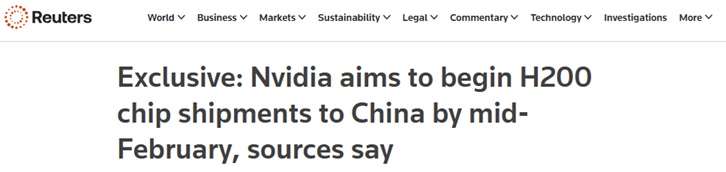 FX168财经报社(亚太)讯 英国路透社周二(12月23日)发布独家报道称,三位知情人士向路透社表示,英伟达(Nvidia)已告知中国客户,计划在2月中旬的农历新年假期前,开始向中国发运其性能第二强的人工智能(AI)芯片。