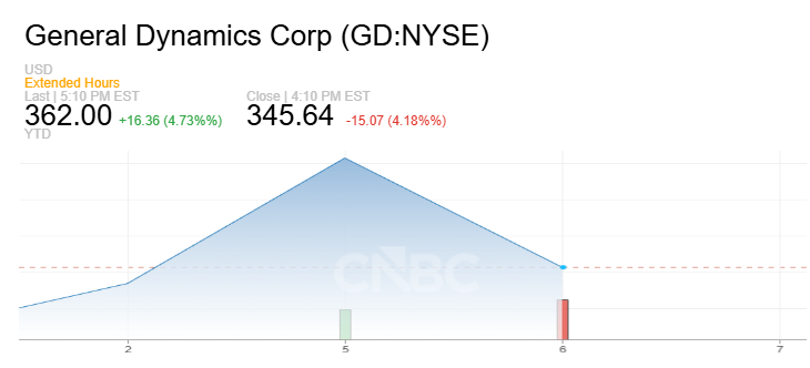 消息传出后,美股军工板块走弱,通用动力、洛克希德·马丁、诺斯罗普·格鲁曼股价均闻讯下跌。