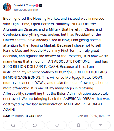 FX168财经报社(北美)讯 美国总统特朗普周四(1月8日)在Truth Social发文称,他正“指示我的代表”买入2000亿美元抵押贷款债券(mortgage bonds),并宣称这一举措将推动利率和居民月供下降,从而改善住房市场的可负担性。