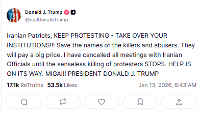 特朗普写道:“伊朗的爱国者们,继续抗议——接管你们的机构!!!把那些杀人者和施暴者的名字记下来,他们将付出沉重代价……帮助正在路上。”