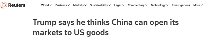 FX168财经报社(亚太)讯 英国路透社周三(1月14日)最新报道称,美国总统特朗普(Donald Trump)当地时间周二表示,他认为中国可以向美国商品开放其市场,并再次宣称他与中国领导人习近平关系良好。特朗普是在与记者互动时发表这番言论的。