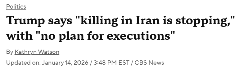 特朗普周三下午在白宫椭圆形办公室对记者表示:“我们被告知,伊朗的杀戮正在停止,它已经停止,正在停止。”他还说:“而且没有处决计划,也不会有处决、处决或处决。我被可靠渠道告知了这一点。我们会弄清楚的。”