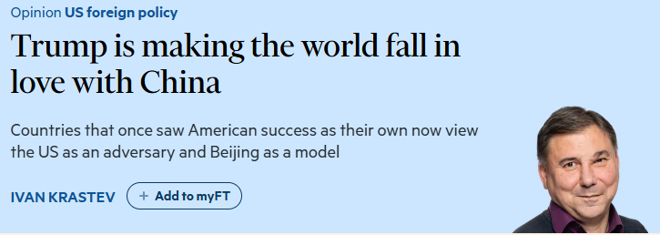人们也会注意“谁在羡慕谁”。而特朗普羡慕中国并非秘密,更令他恼火的是,这种羡慕并未得到对等回应。美国总统对中国的工业能力心驰神往,以至于他如今开始模仿“中国式”的国家资本主义。仿佛特朗普已经对美国自身的政治经济体系失去信心。俗话说,模仿是最高形式的恭维,而现在变成了华盛顿在模仿北京。