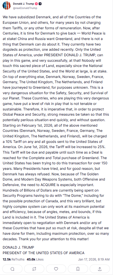 根据特朗普在Truth Social发布的内容,关税对象包括丹麦、挪威、瑞典、法国、德国、英国、荷兰和芬兰。新关税将于2月1日从10%起征,并在6月1日上调至25%。外界普遍预计,这一轮关税将叠加在美国现行对上述国家(及欧盟)商品已实施的关税之上,从而进一步抬升整体税负。