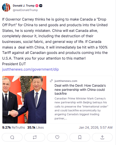 此次“100%关税”威胁发生在特朗普撤回邀请加拿大加入其所谓“和平委员会(Board of Peace)”的第二天。此前卡尼在达沃斯世界经济论坛的讲话中警告全球超级大国对其他国家实施“经济胁迫”。卡尼在演讲中称,世界“中等强国”必须联合起来抵制来自最大强国的胁迫;他还在本周提出,强国正在把“经济一体化当作武器”“把关税当作筹码”“把供应链当作可被利用的脆弱点”,并形容当前是全球性“断裂(rupture)”而非过渡。