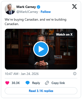卡尼周六在社交媒体上发布了一段预先录制的、带有竞选风格的视频,强调“购买加拿大货、建设加拿大”,以应对来自其他国家的经济威胁。尽管意图明显,但视频中并未直接点名美国。