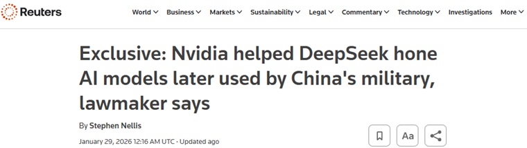 FX168财经报社(亚太)讯 英国路透社周四(1月29日)发布独家报道称,美国众议院“中国事务特别委员会”主席穆勒纳尔(John Moolenaar)在一封信中表示,美国芯片制造商英伟达(Nvidia)帮助中国的DeepSeek优化人工智能(AI)模型,这些模型后来被中国军方使用。