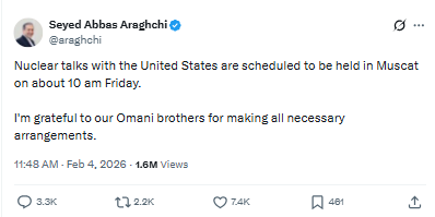 FX168财经报社(北美)讯 伊朗外交部长阿巴斯·阿拉格齐(Abbas Araghchi)周三(2月4日)宣布,美伊核谈判将于周五在阿曼举行。在德黑兰上月对全国性抗议采取强力镇压、导致美伊紧张持续高企的背景下,这一安排备受外界关注。