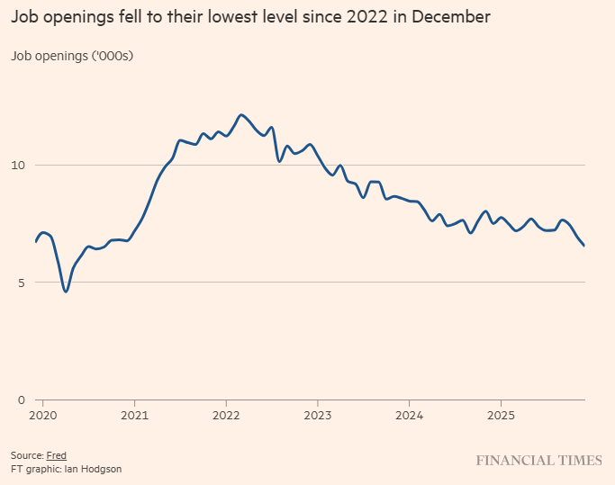 同日,美国劳工统计局(BLS)在另一份报告中指出,2025年12月职位空缺大幅下降至654万,环比减少38.6万,较2025年10月水平减少超过90万,为2020年9月以来最低。